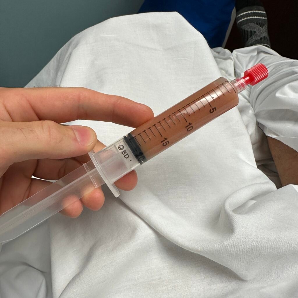 I woke in my hammock, reluctant to rise, then gathered myself for the trip to Charlotte. At Novant Health, the radiology team prepped me for the aspiration I had been requesting for over a year. Under ultrasound, they withdrew 25 mL of reddish-orange fluid from my hip. Seeing it leave my body was surreal — both relief and confirmation.